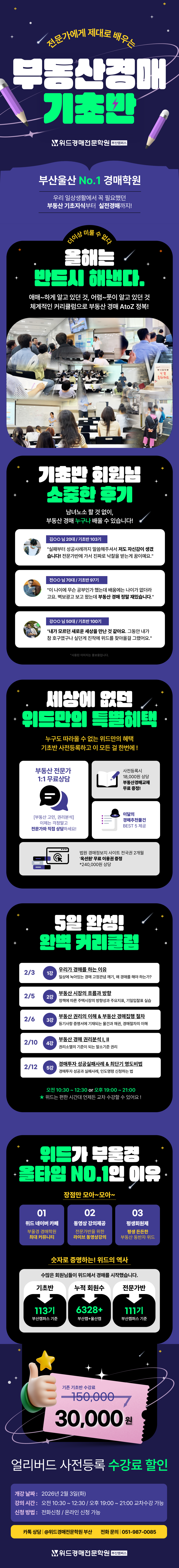 기초반 수강신청 부산 위드경매전문학원2월 기초반 커리큘럼 안내 & 수강신청 관심분야가 같은 사람들이 모여더~ 재미있는2월, 위드 기초반 바로! 들어오세요 2월 기초반 수강신청 → 실시간 카톡문의 1월 기초반 수강신청 → 2월 기초반 수강신청 → 실시간 카톡문의 ※ 안내 : 울산캠퍼스와 부산캠퍼스 커리큘럼에는 개강일정 및 커리큘럼 상에 차이가 있을 수 있습니다. ☎문의전화 051-987-0085 (위드 부산경매학원)