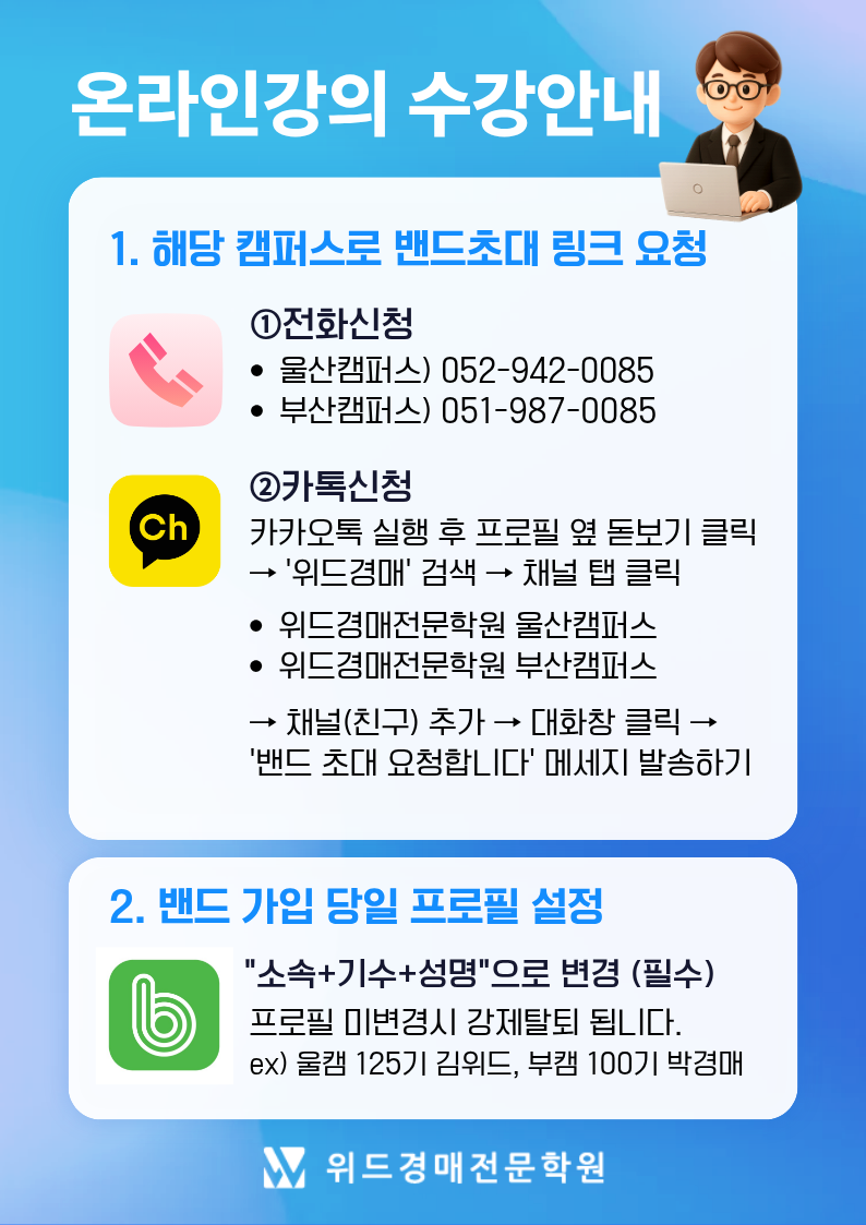 위드경매학원 온라인강의 수강안내 위드 전문가반 혜택 중 하나인 온라인강의 수강방법을 안내드립니다.위드경매전문학원 온라인강의는 네이버밴드 '위드경매 온라인강의'에 가입하시면전문가반 현장 강의를 라이브로 수강하실 수 있으며 한 달 이내의 수업은 녹화본으로도 수강하실 수 있습니다.* 강의 밴드 가입 방법)1) 카카오톡 채널 '위드경매전문학원' 검색2) 채널 추가 후 대화 신청3) '강의 밴드 초대 링크 요청합니다' 메세지 보내기4) 초대 링크 받고 클릭한 후 가입하기5) 가입 승인 받은 후 프로필 변경(소속+기수+성명)
